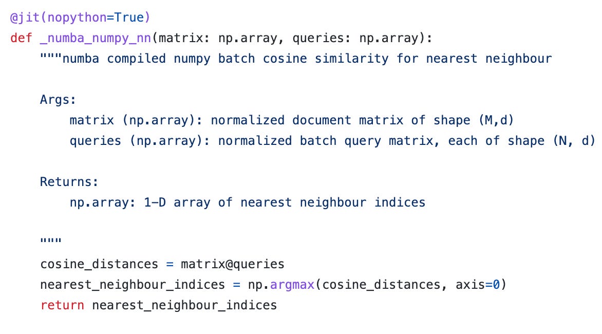 NumPy based - The cosine similarity function is written using NumPy APIs and then compiled with Numba.