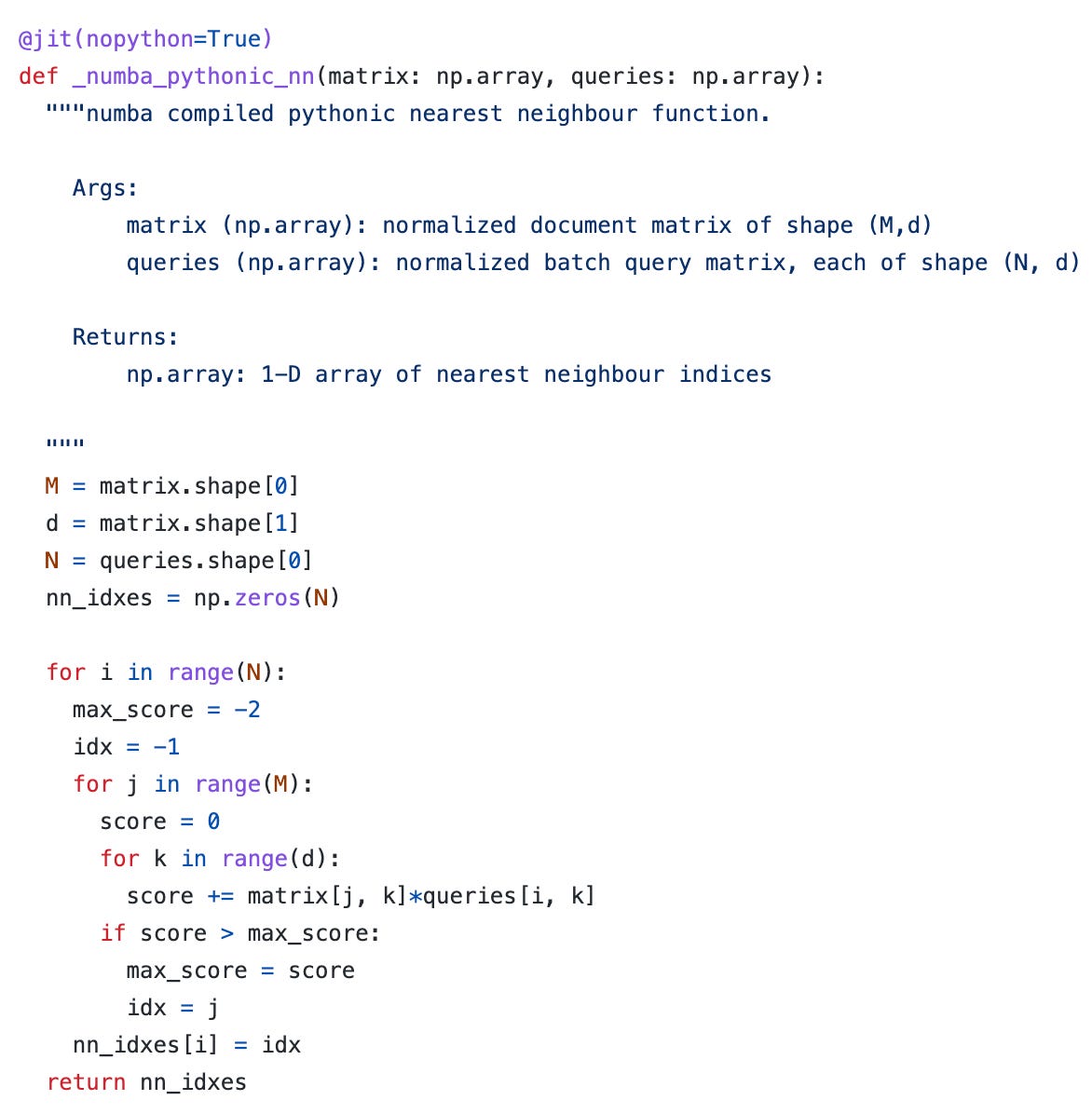 I investigate two different implementations using Numba.Pythonic - The cosine similarity function, written in pure Python using nested for loops, is compiled using Numba.