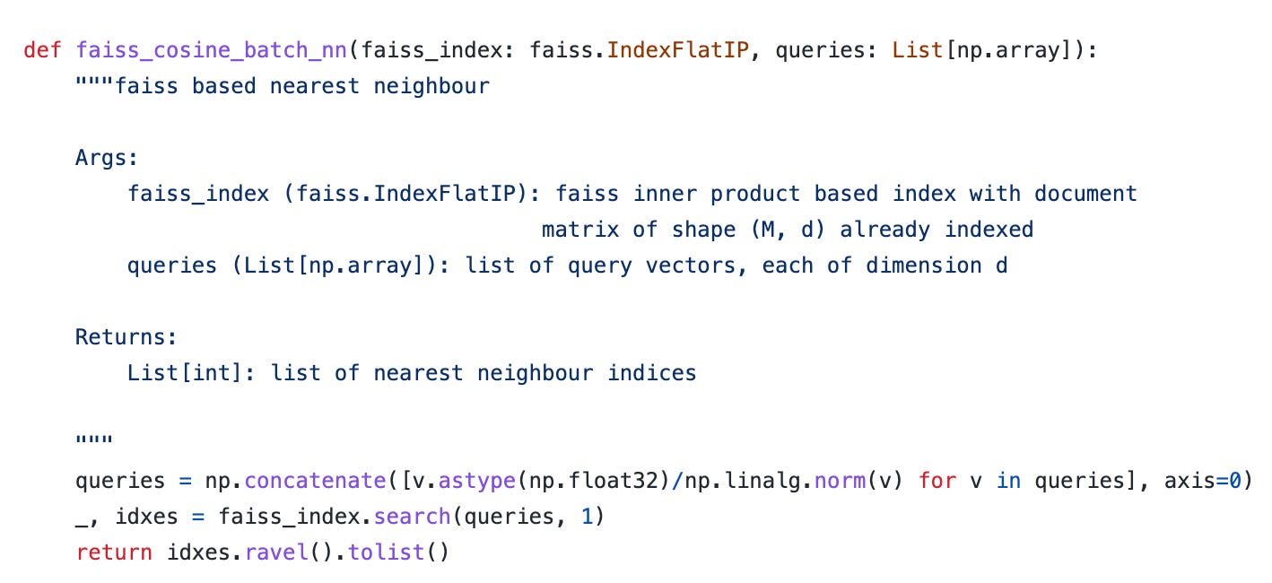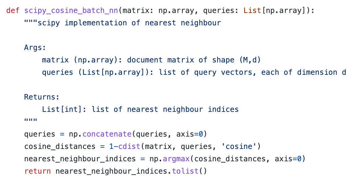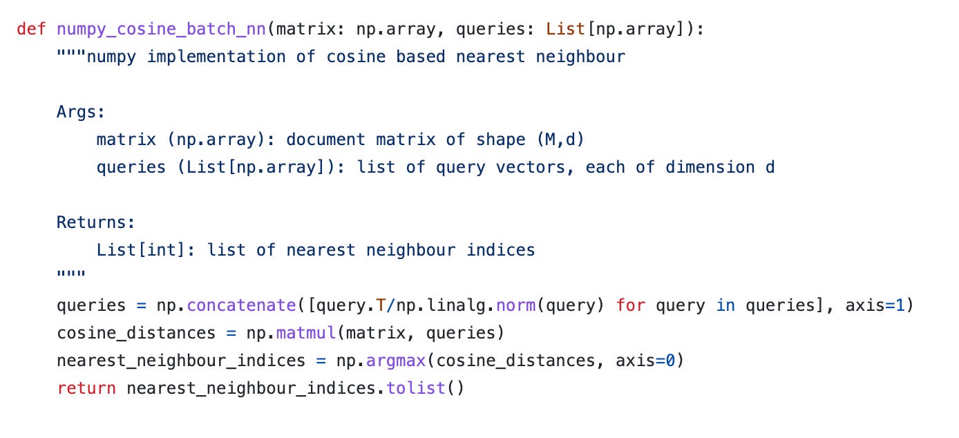 Note that the operations were optimized by normalizing the document matrix beforehand, requiring only the query matrix normalized at run time.