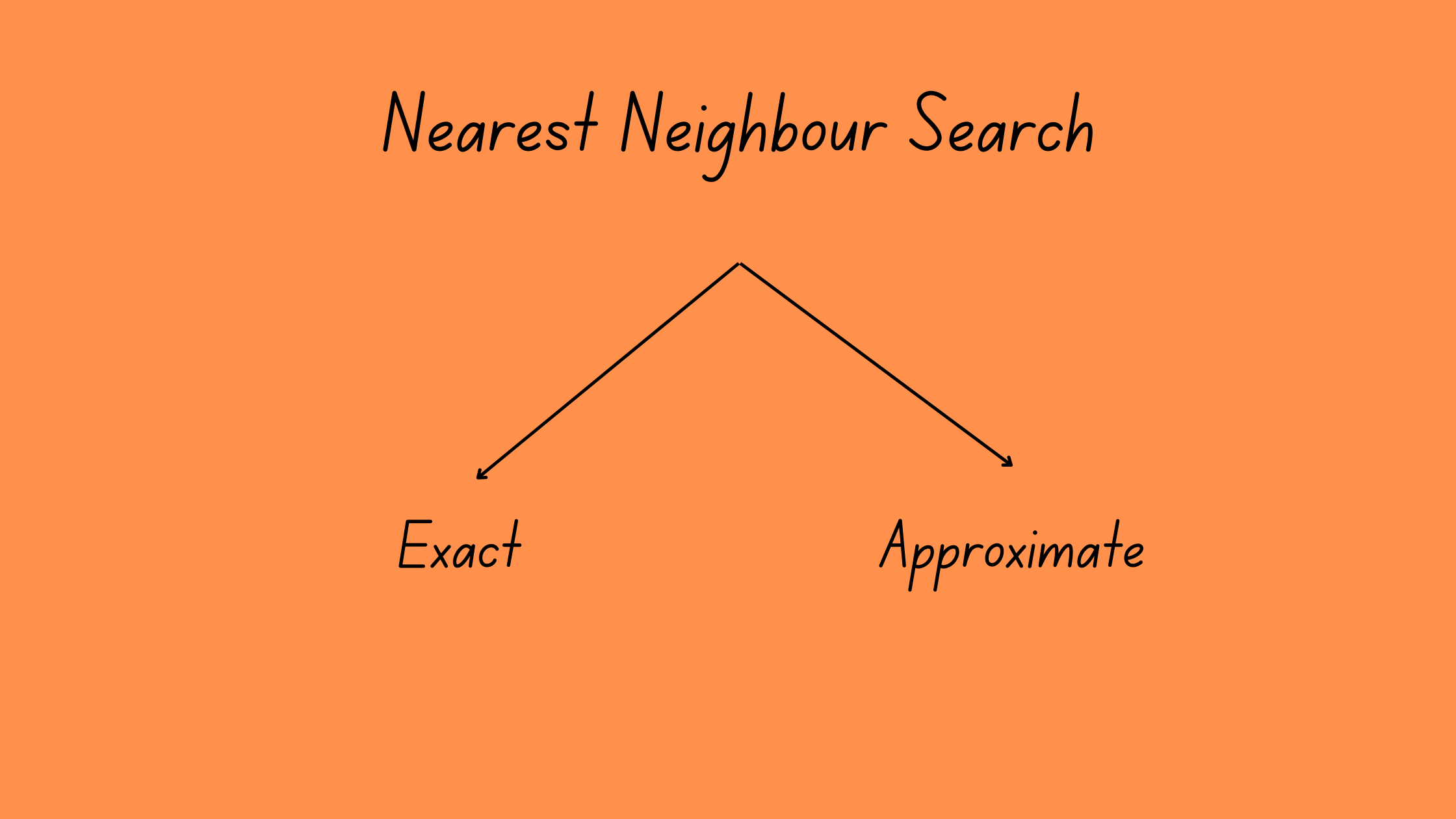 For vectors with d dimensions, each cosine similarity computation has O(d) time complexity, and for M such operations, O(M*d). As M increases, the overall compute time increases, which is not good. Hence, we wish to make this process as quick and scalable as possible. In industry, there are two ideas to do a nearest neighbour search - Exact and Approximate.
